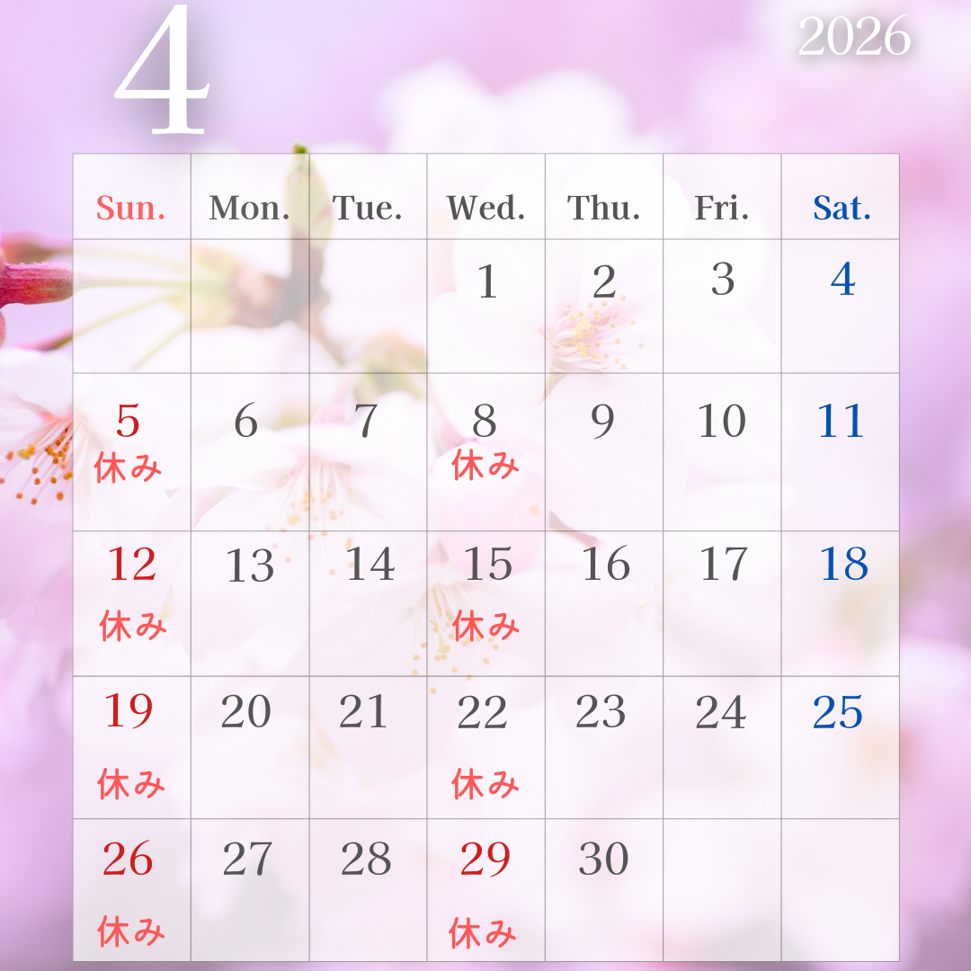 2026年4月の休診日は下記の通りとなります。ご迷惑をおかけいたしますが、何卒宜しくお願い致します。